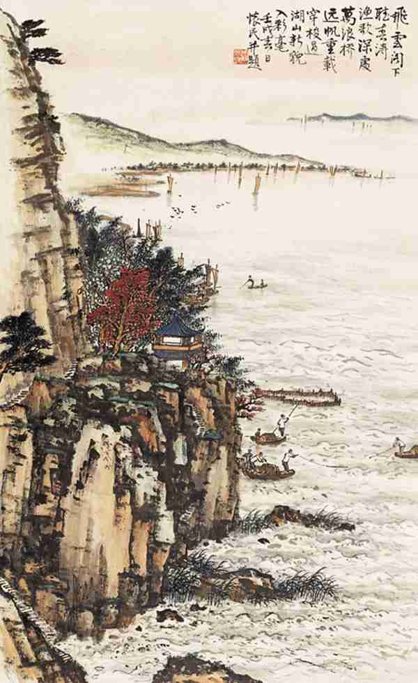 设色纸本 立轴 壬戌(1982年)作 钤印:周怀民 款识:飞云阁下听春涛, 渔歌深处万浪桥。 远帆重载穿梭过, 湖山新貌入彩毫。 壬戌春日,怀民并题。