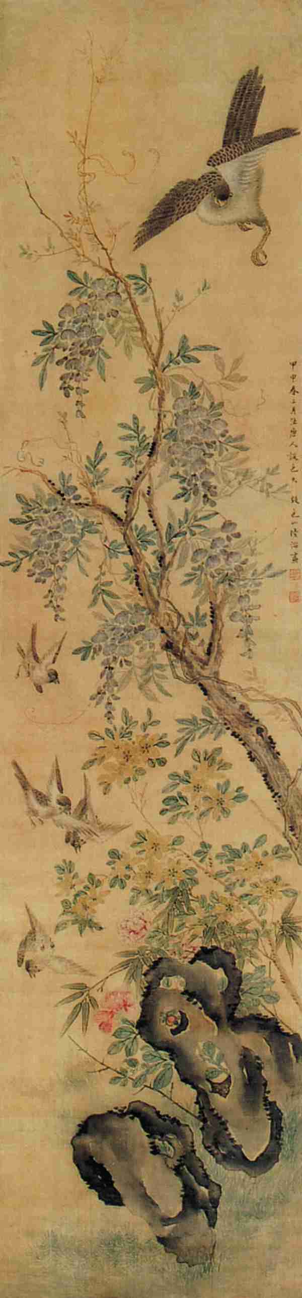 设色绢本 立轴 甲申(1524年)作 钤印:陆氏叔平 包山子 款识:甲申春三月,法唐人设色大致,包山陆治画。