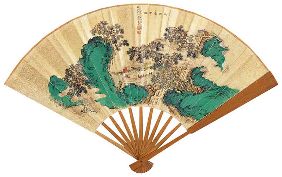 洒金纸本 成扇 钤印:李霈书画 款识:仿宋人院本设色法,请铁夫先生正,云仙李霈