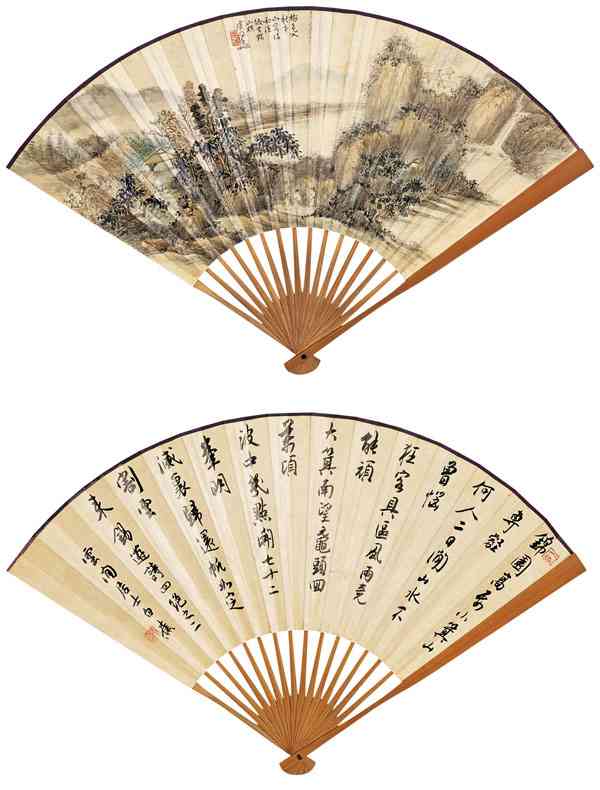 设色纸本 成扇 钤印:重烟 大吉 复翁私印 款识:(正面)仿黄鹤山樵, 虞山沈重烟。 (反面)云间居士白蕉。