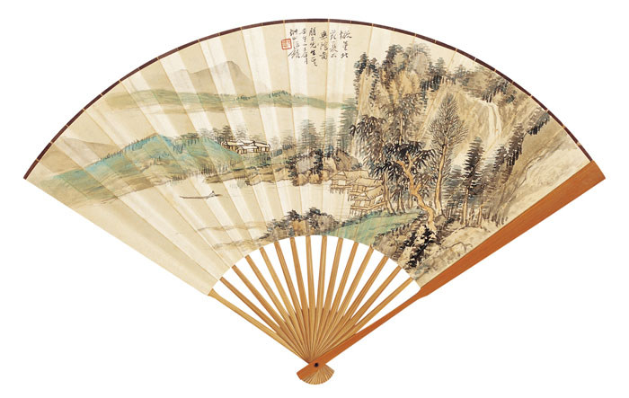 设色纸本 成扇 壬午(1942年)作 钤印:汪琨 袁希濂 款识:(正面)仿董北苑《夏木垂阴图》, 朋三先生正之。壬午小春月,仲山汪琨。 (反面)壬午秋,朋三仁兄雅正,袁希濂时年六十有九。