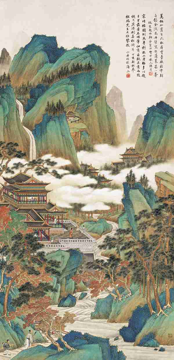 设色纸本 立轴 丁亥(1947年)作 钤印:小舟所作 陈达长寿 志超临古 款识:仿宋赵伯驹金碧法, 览云散人陈达。丁亥新秋,奉祖瑞先生大雅鉴教,小舟作於海上。