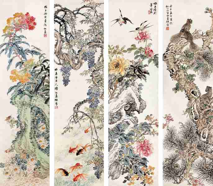 设色纸本 立轴(四屏) 壬午(1942年)作 钤印:陈摩(3) 瓄陁 款识:(一)览王叔楚画法,瓄陁。 (二)师忘庵老人法,瓄陁陈摩。 (三)仿王澹轩笔,瓄陁。 (四)壬午孟冬写於松化石室,瓄陁陈摩。
